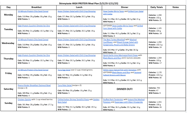 A free, 7-day high protein diet meal plan including breakfast, lunch and dinner ideas and a shopping list. All recipes include macros and Weight Watchers points.