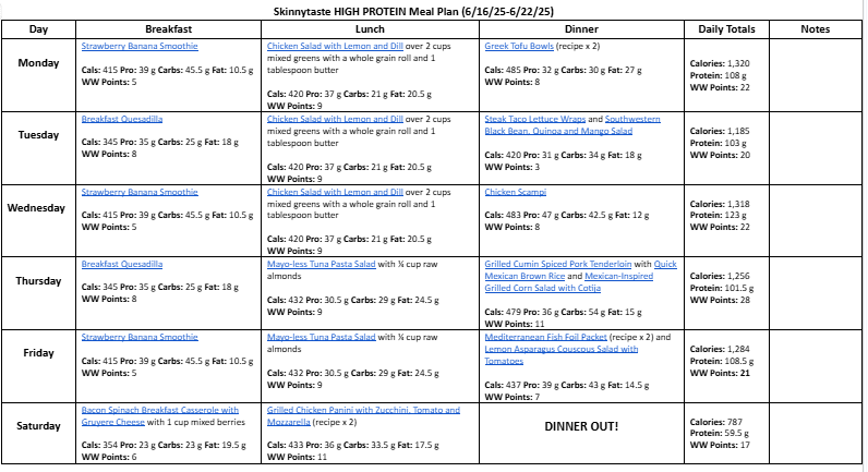 As school comes to an end, vacations come to life! But remember, even on the run — whether you’re in an Airbnb, hitting the road, or sleeping under the stars, you can still crush your high-protein goals! Think healthy snacks like jerky and Greek yogurt, or keep it classic with grilled fish (on this week’s meal plan!), or some of my other campfire packet recipes like my shrimp scampi, and meatloaf! Don’t forget: hard-boiled eggs travel well and cottage cheese makes a great breakfast. Stay fueled, stay strong, and make this summer your healthiest yet!