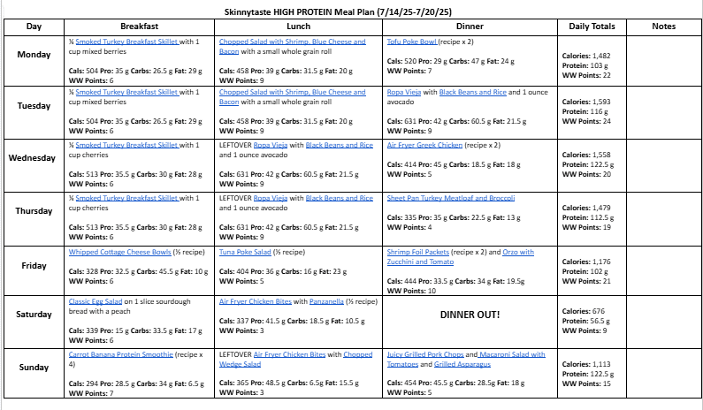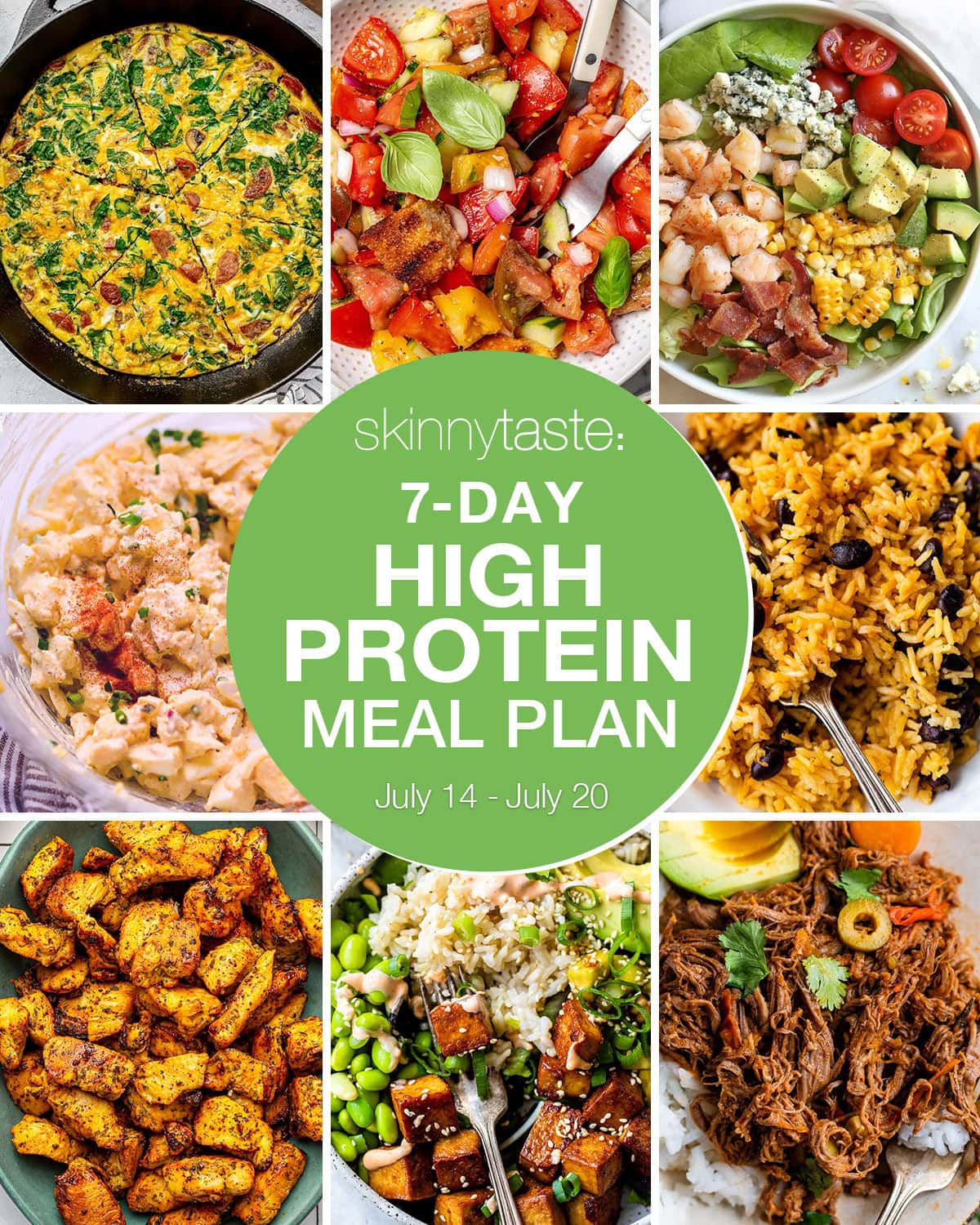 A free, 7-day high protein diet meal plan including breakfast, lunch and dinner ideas and a shopping list. All recipes include macros and Weight Watchers points.