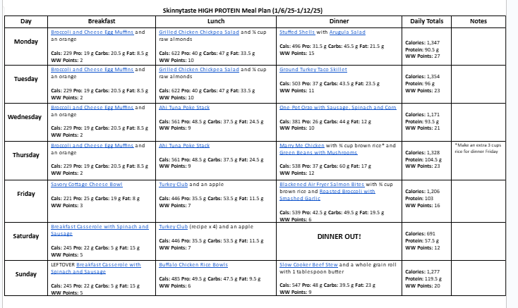 Happy New Year! Hope you enjoy the first High Protein Meal Plan for the new year! As we kick off 2025 I am challenging myself to hit my daily protein goals, eat at least one cup of veggies or fruit with every meal (I aim for 5 cups a day) to help me reach my fiber goal of 25g per day, walk 10,000 steps a day, lift weights at least 4 times a week and focus on good sleep and reducing stress. What are your goals this year?