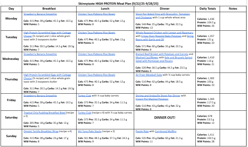 A free, 7-day high protein diet meal plan including breakfast, lunch and dinner ideas and a shopping list. All recipes include macros and Weight Watchers points.