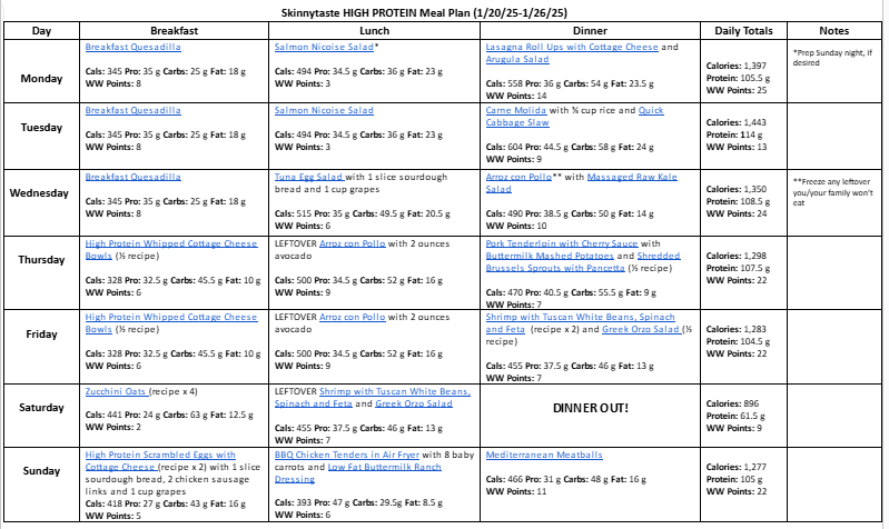 A free, 7-day high protein diet meal plan including breakfast, lunch and dinner ideas and a shopping list. All recipes include macros and Weight Watchers points.