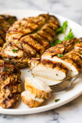 I grilled boneless, skinless chicken breasts over medium heat for 4 to 6 minutes on each side. To make sure they’re fully cooked, insert an instant read meat thermometer into the thickest part of the breast—it should read 165°F.