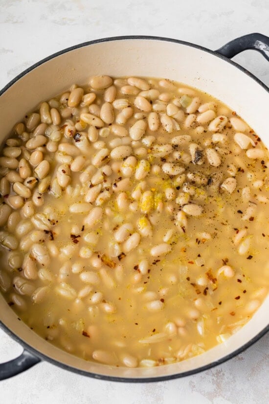 2. Simmer the beans: Add the cannellini beans, broth, zest, salt, and pepper, then bring to a boil. Reduce the heat to low, partially cover the pot, and simmer for 15 to 20 minutes.