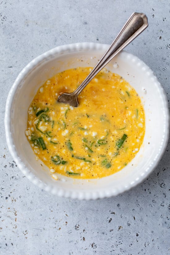 - Prep the Eggs: Crack the eggs into a bowl, season with salt and pepper, and whisk in the cottage cheese and scallions.