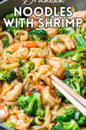 I love Thai food, and for years my favorite spot in Brooklyn served the best drunken noodles — still one of my all-time favorite dishes along with Pad Thai. This homemade version brings those same bold flavors to your kitchen: chewy rice noodles tossed with shrimp, eggs, and vegetables in a spicy, savory, and slightly sweet sauce, finished with a squeeze of lime.
