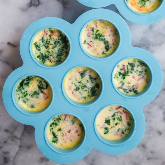 Make sure to drain any liquid from the bell peppers and spinach to ensure creamy egg bites. You can pat the bell peppers dry with paper towels and wrap the spinach in a towel, and squeeze out any water. See the recipe card at the bottom for printable directions.