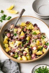 If you start with cooked octopus, the only cooking you’ll do is boil potatoes. Everything else is just chopping and tossing. See the recipe card at the bottom for printable directions.
