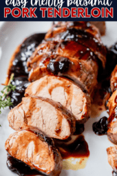This easy Pork Tenderloin with Cherry Sauce is juicy and tender, topped with a sweet-tart sauce made with balsamic and cherry preserves. It’s the perfect balance of flavors—savory, sweet, and a touch tangy!