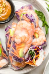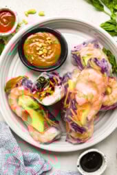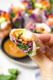 I love these fresh homemade Vietnamese-style summer rolls filled with shrimp, avocado, raw veggies and fresh herbs plus a delicious peanut hoisin dipping sauce.